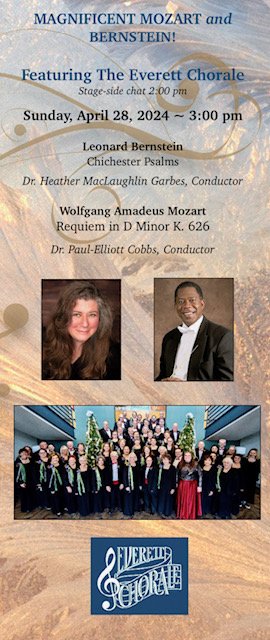 Join the Everett Chorale and the Everett Philharmonic Orchestra for a combined concert featuring music by Mozart and Bernstein.